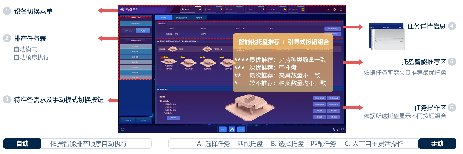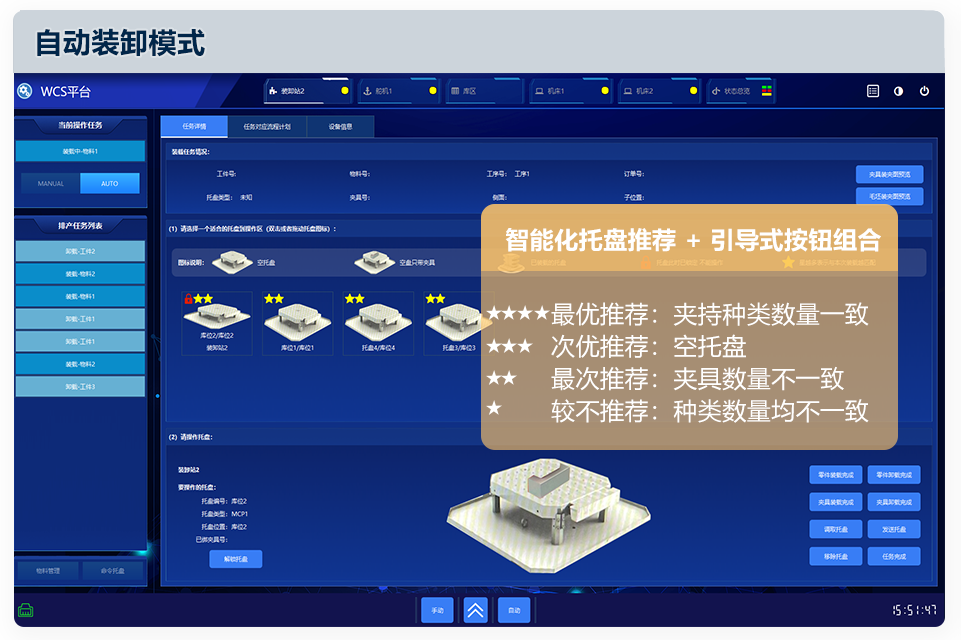 集成托盘装卸任务自动排产及托盘智能推荐功能,引导式交互逻辑可提升易用性