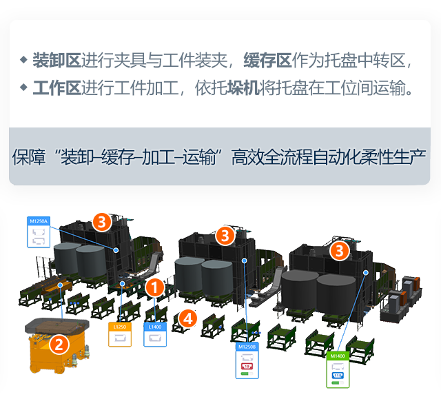 硬件部分由“机床”、“装夹站”、“运载舵机”、“缓存库区”四部分组成